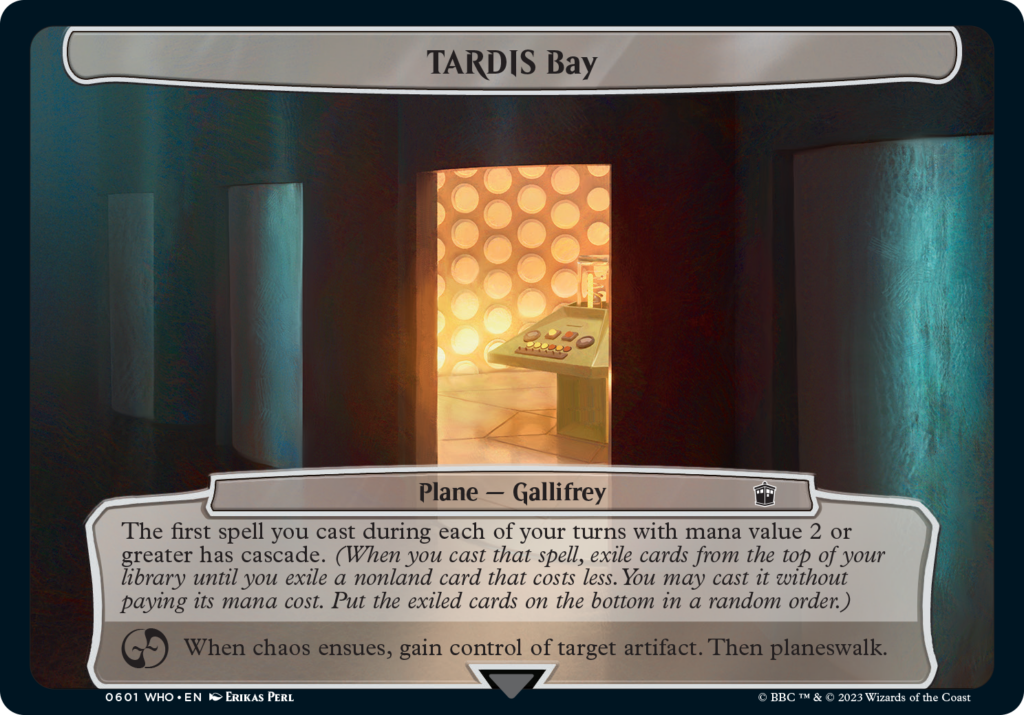 In addition to giving your next spell Cascade, TARDIS also gives you the opportunity to Planeswalk. This ability specifically references Plane cards, which originated in Planechase and are utilized in the Planechase format. These cards are designed to add another layer to MTG, most commonly in Commander games, by having a specific ability associated with them. TARDIS Bay, for example, is a new Plane card from Doctor Who with abilities associated with the card TARDIS, where everyone’s first cast spell with mana value two or greater has Cascade.