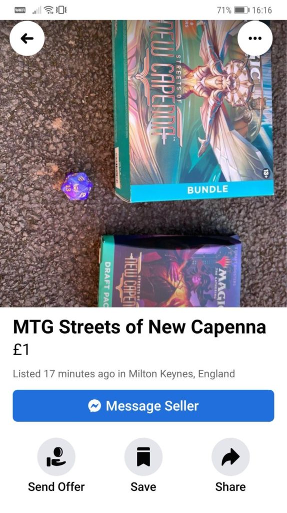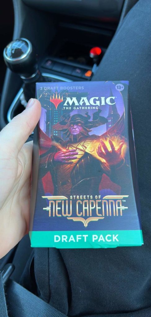 Reddit user, Gengar_Pirate, saw these images show up on their local Facebook Marketplace. The first image shows the packaging for the New Capena Bundle, and a Draft Pack, and the spin down dice. The bundle pack art is incredible, showing a Demon driving an old school convertible with an Angel as the hood ornament. Could we see more Vehicles in this set? I’d wager we will.