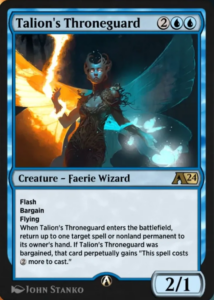 Talion’s Throneguard is rather understatted for a four-drop, but it can function as a sort of counterspell creature, which is incredibly powerful. Capable of bouncing a spell or nonland permanent to hand, Talion’s Throneguard is rather versatile. The Bargain is a nice upside that can delay an opposing four drop like The One Ring or Sheoldred, the Apocalypse, giving you time to come up with a plan to keep it off the board.