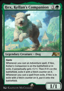 Hex, Kellan’s Companion looks powerful enough to incentivize an aggressive adventure strategy. Presenting a combination of burst damage, a growing body, and something surprisingly difficult to remove thanks to Hex jumping between exile and the battlefield, there is a lot of promise here.