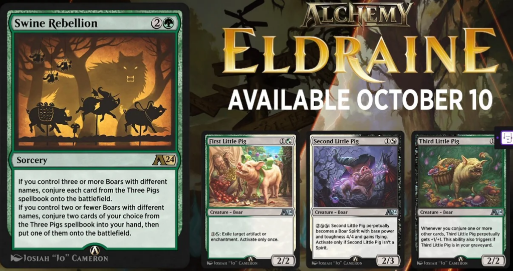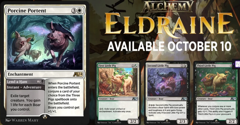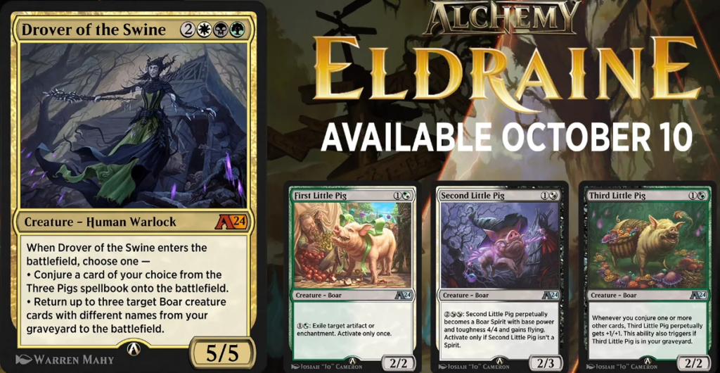 A collection of cards that conjure cards from the Three Pigs spellbook are releasing as a part of Alchemy: Eldraine. To reiterate for all the non-Arena players out there, Conjure refers to one of the cards in the referenced collection (the three pigs in this instance), appearing in your hand. It is an individual card after that point, and the card Conjured is selected at random.