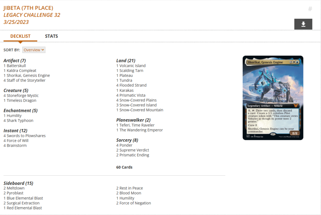 Alongside Expressive Iteration’s ban, legacy saw White Plume Adventurer leave the format – potentially forever. This was a core card in the Mono White Initiative archetype that dominated the Legacy format alongside Delver before the ban. This has caused a massive shakeup in the Legacy metagame, and one of the new decks that has popped up due to the shakeup is a Stoneforge Mystic control deck that uses Heart of the Storyteller as a synergistic draw engine off of the tokens that Living Weapon creates alongside Shark Typhoon, Eternalize triggers and Shorikai, Genesis Engine.
