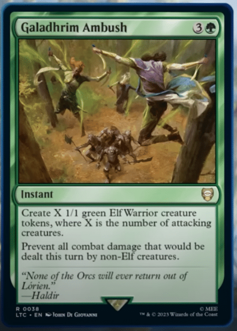 The Lord of the Rings Commander decks have finally been revealed. We’re still taking our time reviewing how each of the decks look, but a few particular spoilers have been catching people’s eye. One can start casting your opponent’s spells for free for as little as three mana, and another appears to be the combat trick Token players have been waiting for! Let’s take a look at Galadhrim Ambush and some other interesting Commander options!
