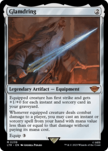 Glamdring offers an incredibly interesting ability for decks who churn through a lot of Instant and Sorcery cards. An obvious contender for this, at first glance, appears to be UR Murktide… until you realize that Glamdring only cares about cards in graveyard. Because Murktide Regent specifically wants to Delve away the very things that Glamdring cares about, there is a severe amount of anti-synergy here. This, combined with its steep equip cost, probably puts this outside of Modern consideration.