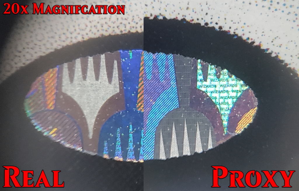 As provided by Reddit user DrunkenSavior, the proxy example on the right-hand side was found when they were using a loupe to verify a Jeweled Lotus purchased by their friend. To clarify, a Security Stamp is a silver dot on the bottom of a Rare or Mythic (and sometimes special print) MTG cards. In the case of Acorn Security Stamps, they can be used to verify if a card is real and its legality in various formats.