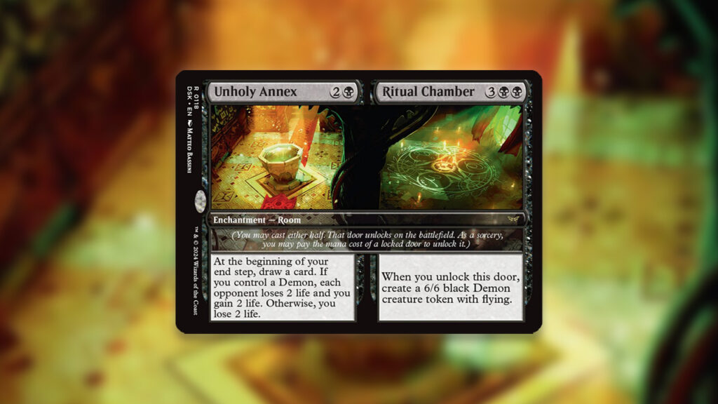 Unholy Annex is the half of this card seeing lots of play. Ritual Chamber is just the icing on the cake. If you run out of things to do, you can create a 6/6 Demon as an add-on to the other card. This portion of the Room sees a lot less use since Unholy Annex is the star of the show, but being able to just create a 6/6 Flying Demon that turns on the life drain part of Unholy Annex as an attached action is ridiculous.