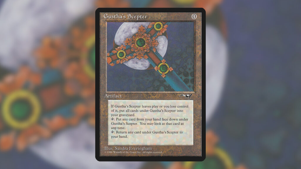 - Card Text: If Gustha’s Scepter leaves play or you lose control of it, put all cards under Gustha’s Scepter into your graveyard. (tap): Put any card from your nad face down under Gustha’s Scepter. You may look at that card at any time. (tap): Return any card under Gustha’s Scepter to your hand.