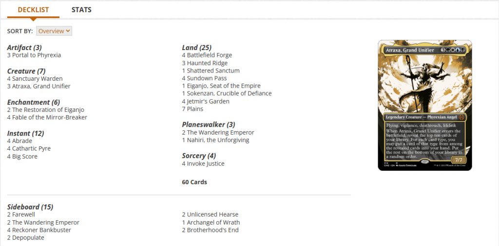 The aforementioned reanimator list can be seen above. This particular 75 took down the Saturday MTGO challenge in the hands of user Tunaktunak. While Gobern’s list seemed more focused on playing a fair midrange/tap-out control game with Atraxa on the top-end, this list sports a cheeky reanimator package with Invoke Justice to bring back haymakers like Portal to Phyrexia, Sanctuary Warden and Atraxa herself.