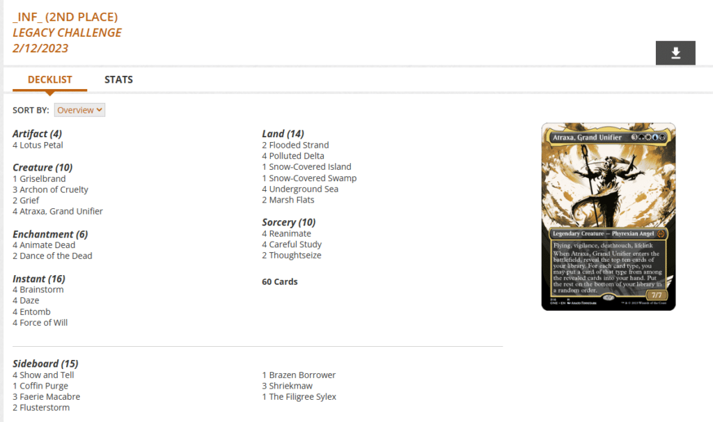 Atraxa’s payoff is so powerful that it’s even seeing some experimentation as a reanimator target in the Legacy format. MTGO user _INF_ managed to top eight a Legacy challenge over the weekend, finishing second after swiss with the above list.