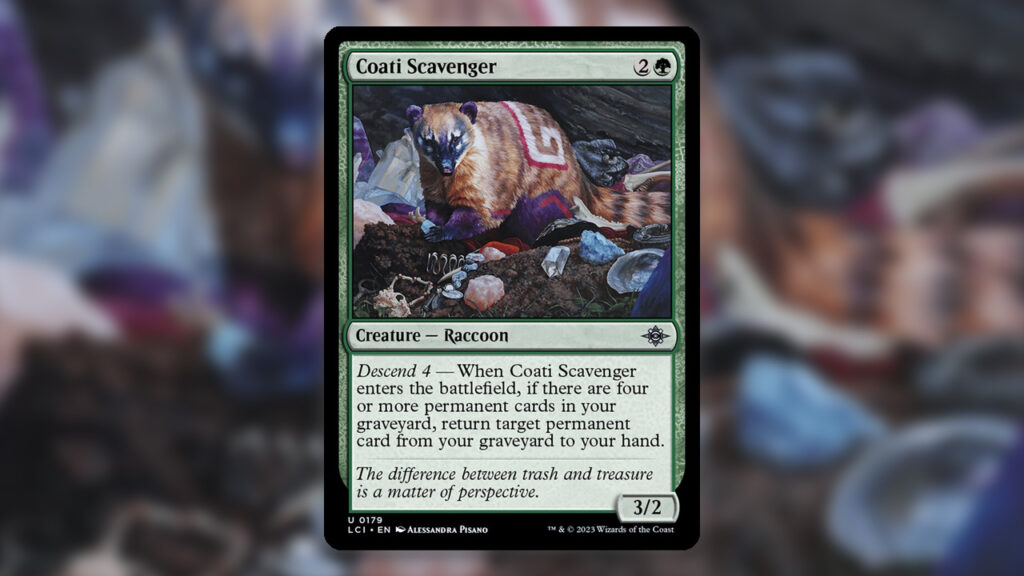- Card Text: Descend 4 – When Coati Scavenger enters the battlefield, if there are four or more permanent cards in your graveyard, return target permanent card from your graveyard to your hand.