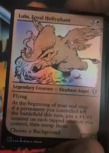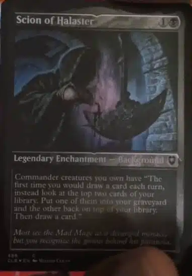 Lastly, we have a new card subtype, Backgrounds. The first picture that we see here has the text “Choose a Background” at the bottom of the card. From what we’ve seen, we don’t know 100% how these will work. My best guess is that “Backgrounds” maybe start outside the game in the command zone, and when you “choose a background” you add one to your hand from the command zone.