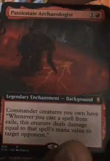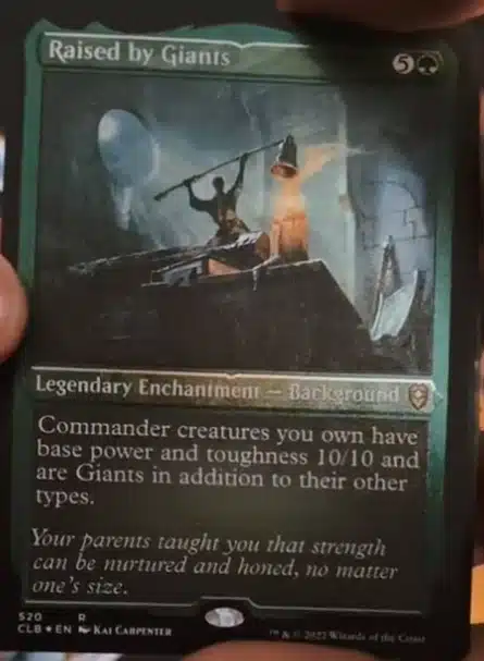 The second picture is actually one of these backgrounds. They are Legendary Enchantments and from the ones that we’ve seen so far, they all affect “commander creatures” that you own. Here’s a few others that are non-green.