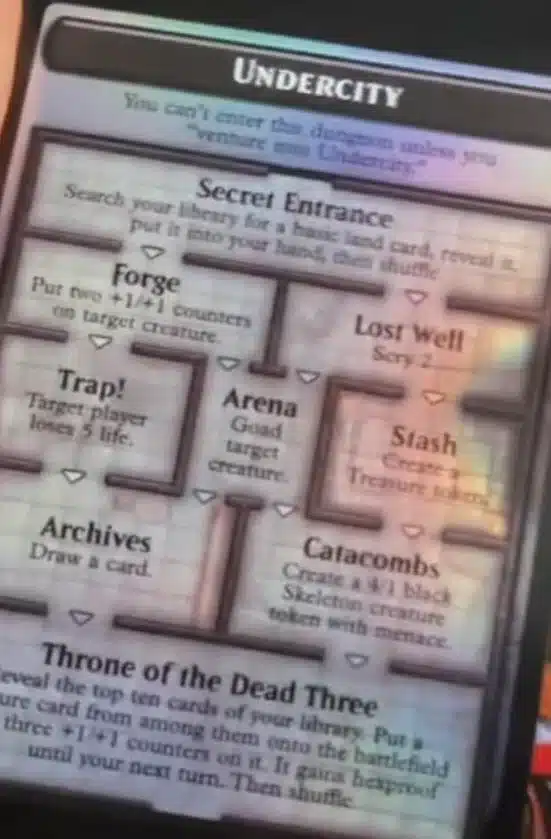 For the Initiative, whenever you gain it or at the beginning of your upkeep if you have it, you venture into “The Undercity”. The Undercity is a brand new dungeon coming with Baldur’s Gate, and it’s actually REALLY good. Every room has a strong effect, but the last room is really good! Getting to dig 10 deep for a free creature is already good, but giving it 3 +1/+1 counters and hexproof is just icing on the cake.
