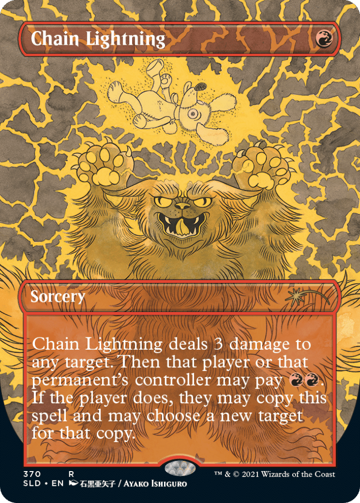 The first card is Chain Lightning. This once powerful legacy burn spell is now a very budget option for burn spell. As for how this pertains to cats, I’m not sure, but I guess it could go into a Naya cats commander deck?