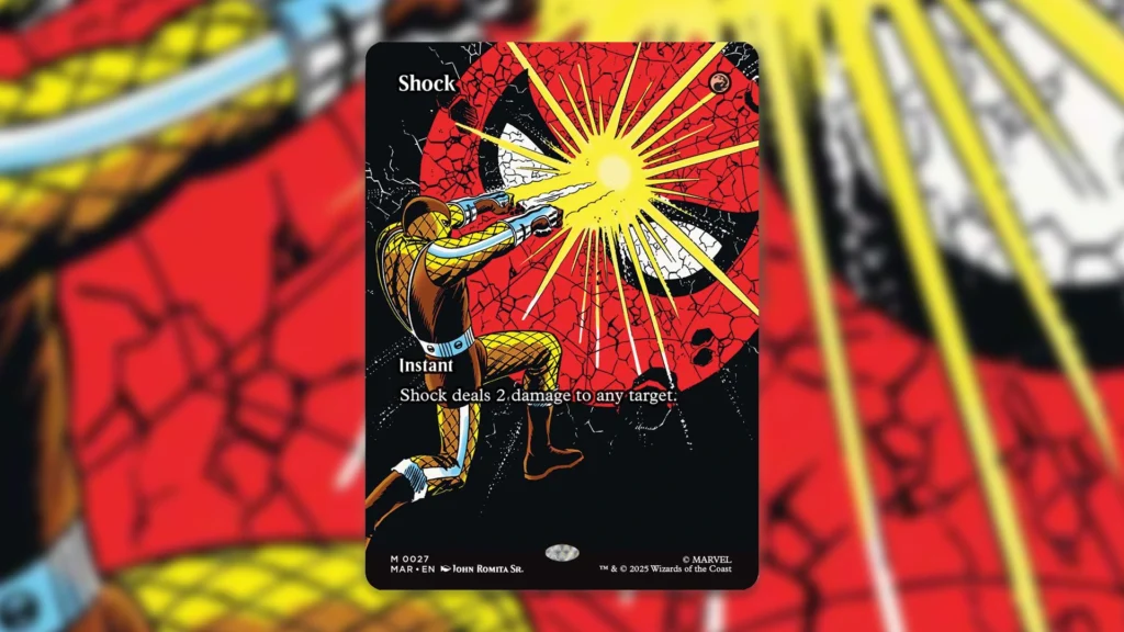 Our last bonus sheet card is Shock, which is definitely the least exciting of the bunch. There have been numerous upgrades to Shock printed over the years. Even in a Standard setting where Lightning Bolt isn’t legal, there are strictly better options to Shock, including Burst Lightning from MTG Foundations. All of that said, the flavor of this Shock alone completely forgives any of that.