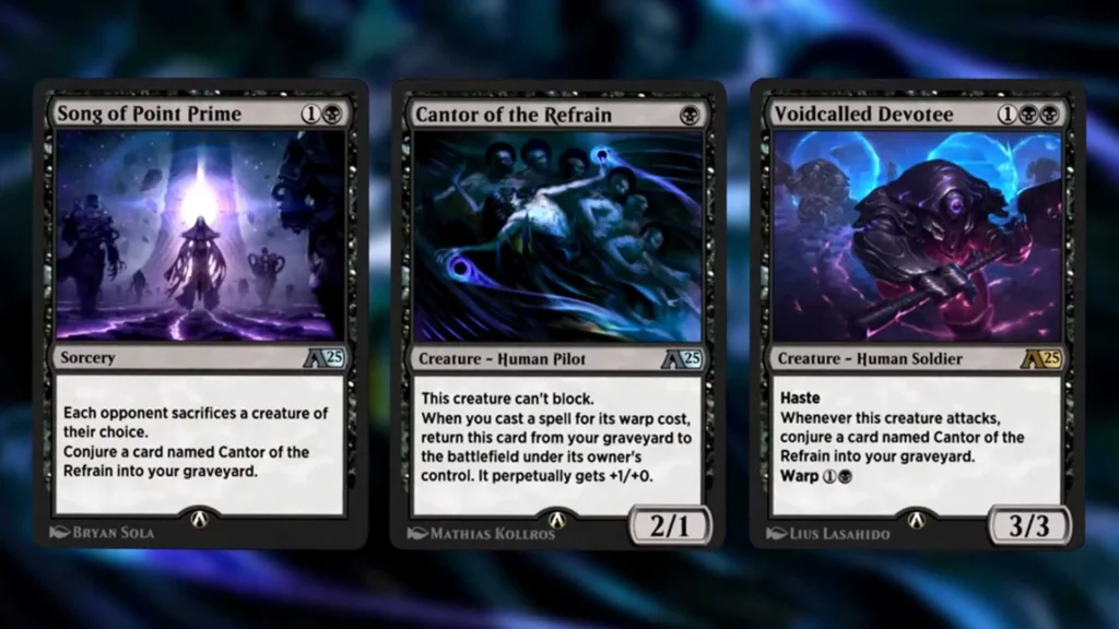 This all starts with the new one-drop addition: Cantor of the Refrain. Cantor is your classic 2/1 that can’t block but can be brought back from your graveyard if it were to die. The key is to pair Cantor with other Warp cards to help bring it back.