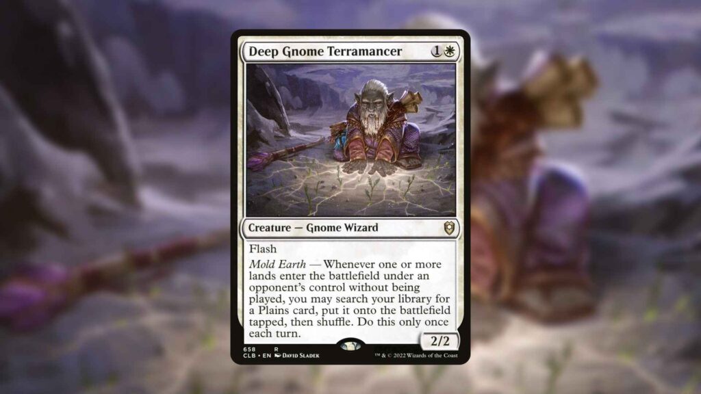 For reference, a land that isn’t played refers to any land that enters play without a player using their land drops. This means that almost all of green’s common ramp options, like Cultivate and Kodama’s Reach, will trigger Deep Gnome Terramancer. The creature can also trigger on extremely common utility lands like Evolving Wilds and Myriad Landscape, meaning that Terramancer will likely get value even if green isn’t at your table.