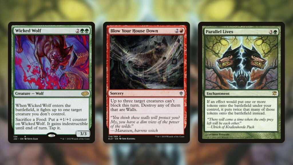 The creatures are, surprisingly, the trickiest part of this. There aren’t a huge number of powerful, recognizable Wolves in Magic’s history. Two of the teaser images show a wolf eating at a table, which would be a great fit for the Food-dependent Wicked Wolf. The accompanying Food could also take up the token slot.