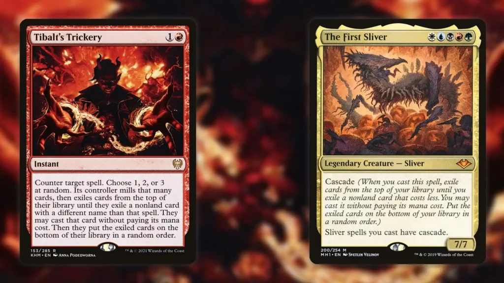 By playing The First Sliver in the command zone, you have consistent access to a Cascade trigger. The way this archetype is constructed, the only spell you can possibly Cascade into with The First Sliver is Tibalt’s Trickery. With The First Sliver still on the stack, Tibalt’s Trickery can counter your Commander and enable you to cast something enormous from your deck.
