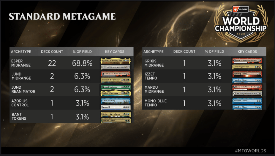 In my opinion, Standard is currently in a pretty miserable place. If this weren’t hinted at by the disgusting 69% meta share rate of Esper Midrange, a deck that players expected would wane in popularity after the ban of The Meathook Massacre. While the stats suggest that this is anything but true, it is essential to note here that this is an incredibly small sample size of a specialized metagame. Generally, whatever deck the biggest team ends up on will have a metagame share like this.