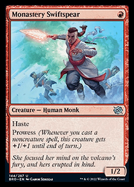 It’s been a long time since players have been asking for this card! Multiple Explorer and Historic Anthologies have passed without the card being announced, and players were remarkably disappointed… and confused. While most speculated that a power level problem was why this card wasn’t introduced, that no longer seems to be the case. Monastery Swiftspear is being reprinted in The Brothers’ War!