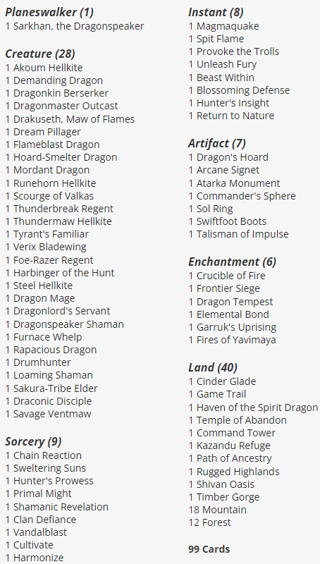 Other valuable reprints in this Commander deck, aside from the usual staples like Sol Ring, include Vandalblast, Elemental Bond, Thundermaw Hellkite, Scourge of Valkas, Runehorn Hellkite, and Haven of the Spirit Dragon.