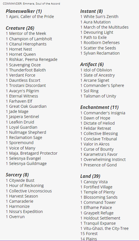 This Selesnya deck features the fan-favorite Emmara, Soul Accord, a two-mana Legendary Creature capable of creating tokens at an insane rate. As what may be made evident by the name and Commander, this deck cares a lot about creating tokens.