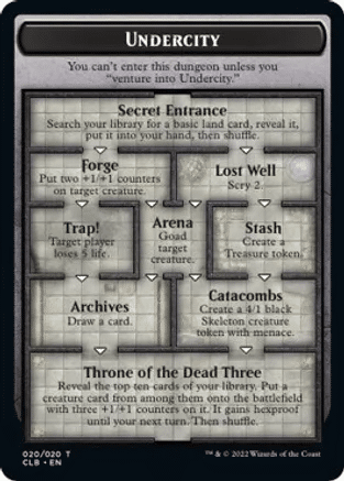 Initiative refers to a dungeon exploring mechanic released in Commander Legends: Battle for Baldur’s Gate. Whenever someone plays a card that allows them to “take the Initiative,” they get to venture into Undercity. When they do so, that player will start in the first room in the dungeon pictured above. From there, players can progress to a room that connects with their current room by either retaking the Initiative or beginning their turn with the Initiative still under control.