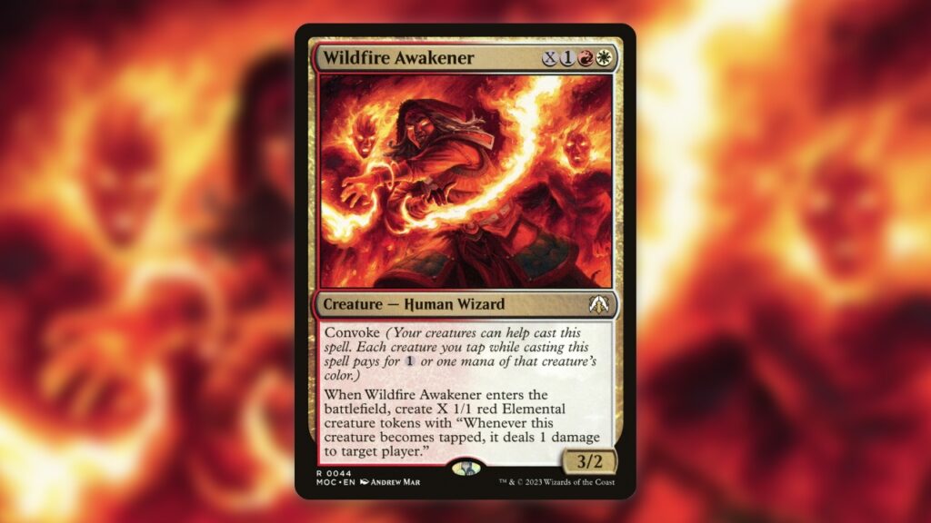 - Text: Convoke (Your creatures can help cast this spell. Each creature you tap while casting this spell pays for 1 or one mana of that creature’s color.) When Wildfire Awakener enters, create X 1/1 red Elemental creature tokens with “Whenever this creature becomes tapped, it deals 1 damage to target player.”