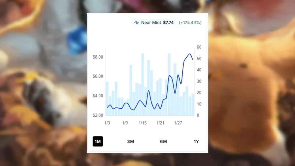 Interestingly, the borderless variant of Phelia spiked even more significantly during this period. Non-foil borderless copies also saw their lowest point on January 11, with a market price of $2.86, and their highest point yesterday, with a market price of $8.70.