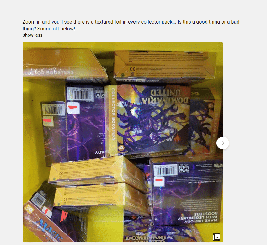 When you zoom in on the Dominaria United Collector Booster Box contents, there is indeed text stating that one Textured Foil will be available in every Dominaria United Collector Booster. Many MTG players are upset that reprinting Textured Foils as a one-in-every-pack guarantee will make them feel “less special over time.” Some comments are a bit more cynical, with Reddit User mirroredspork stating that his “favorite gimmick will be when special treatment cards feel special again.”
