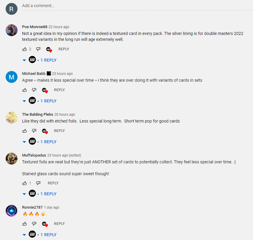 Shown above is a mish-mash of images in a thread started by Redditor u/sawdatstyle highlighting that Textured Foils will be returning in Dominaria United. This new foiling technique introduced in Double Masters 2022 is rather stunning and uses textures to help make the foiling patterns on an MTG card pop. While this is an exciting event for some, many MTG commentators were not fond of the returning treatment for a different reason.