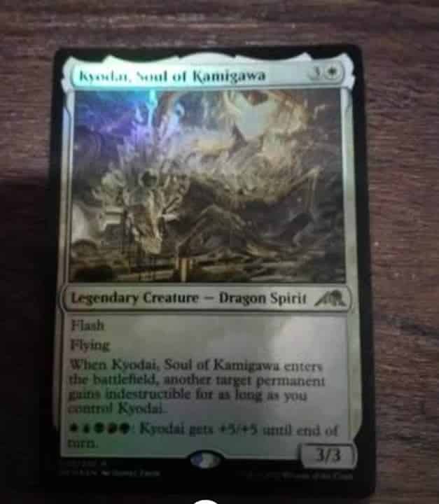 First off, the first card we have is Kyodai, Soul of Kamigawa. This is a 3 mana 3/3 Dragon with Flash and Flying and gives something indestructible. It also has a WUBRG ability, which is a return from the original Kamigawa.