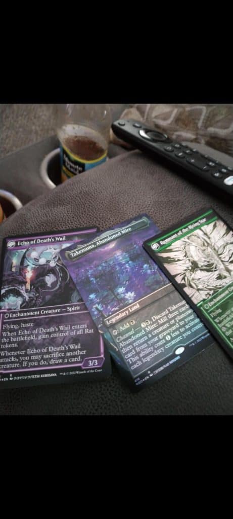 We can’t see much about the Remnant of the Rising Star, except that it has some kind of X cost in it. Echo of Death’s Wail seems to deal with Rat tokens, which we can assume the front side makes. Lastly Takenuma has a returning mechanic, Channel. Wizards has stated that they wouldn’t be printing Legendary Lands in Standard products much any more, but if this card is real, that’s changing. Mostly the reason for that is that drawing multiples in a game feels bad, but with Channel, that is no longer a concern.