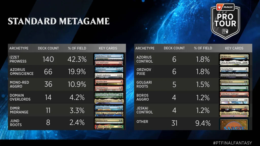 42.3% of Pro Tour Final Fantasy’s metagame is Izzet Prowess. That’s more than double the representation of Hogaak from the infamously dubbed ‘Pro Tour Hogaak’ event. To quote MTG Hall-of-Famer Frank Karsten, Izzet Prowess “boasts the highest share of any deck since the Pro Tour’s return in 2023, surpassing even Esper Midrange’s 31.4% showing at Pro Tour Thunder Junction.”