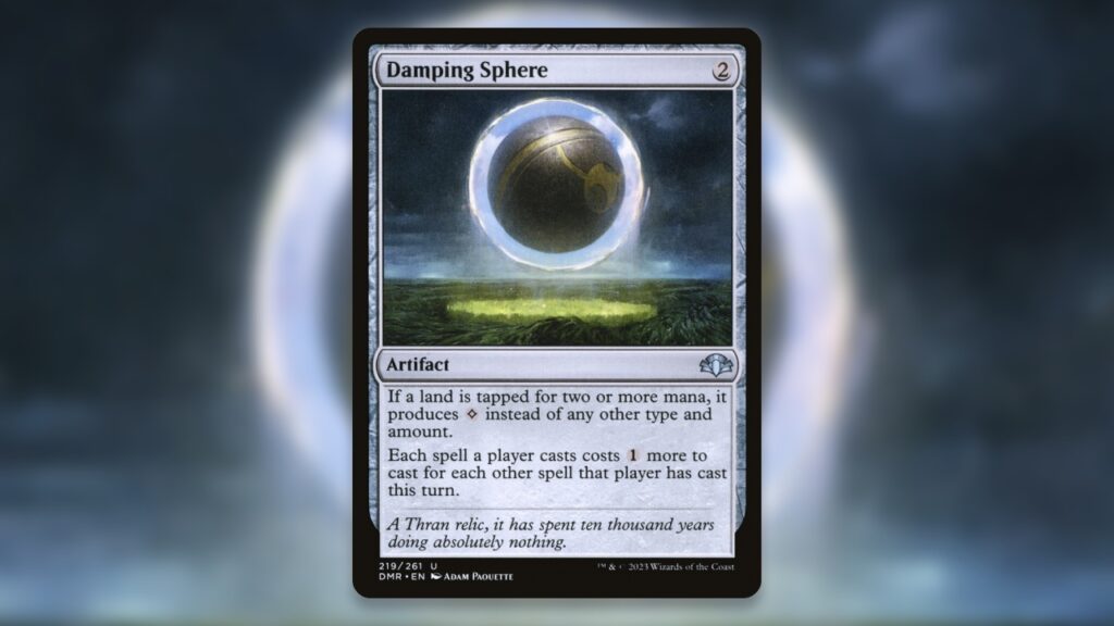 But wait, there’s more! Damping Sphere’s other ability is perfect against another Modern menace: Ruby Storm. At 9.5%, this deck has a similar overall meta presence to Eldrazi. For those unversed in its ways, Storm wins by chaining a bunch of Ritual and draw spells before winning the game on the spot with a Grapeshot. Damping Sphere forces your opponent to pay more mana for each spell they’ve cast in a turn, which prevents them from doing so.