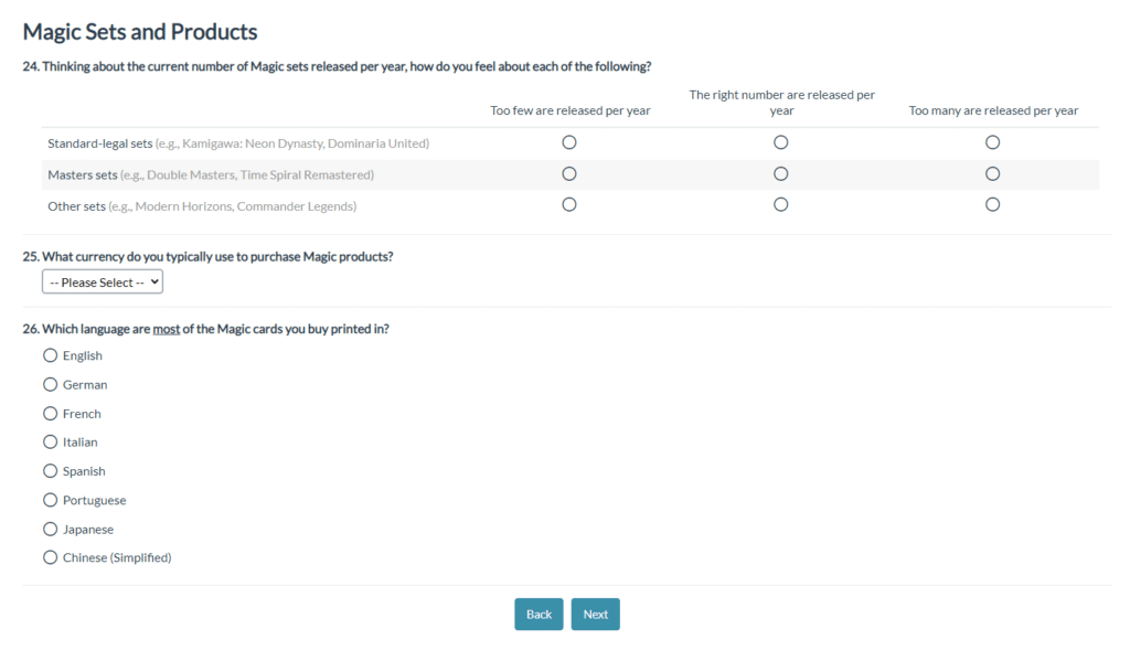 Overall, the survey feels more like a ‘how much money do you spend on magic and how many people can you get involved in magic’ than a survey about what we like about Magic.” – Dusk007