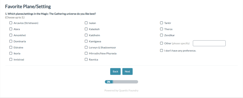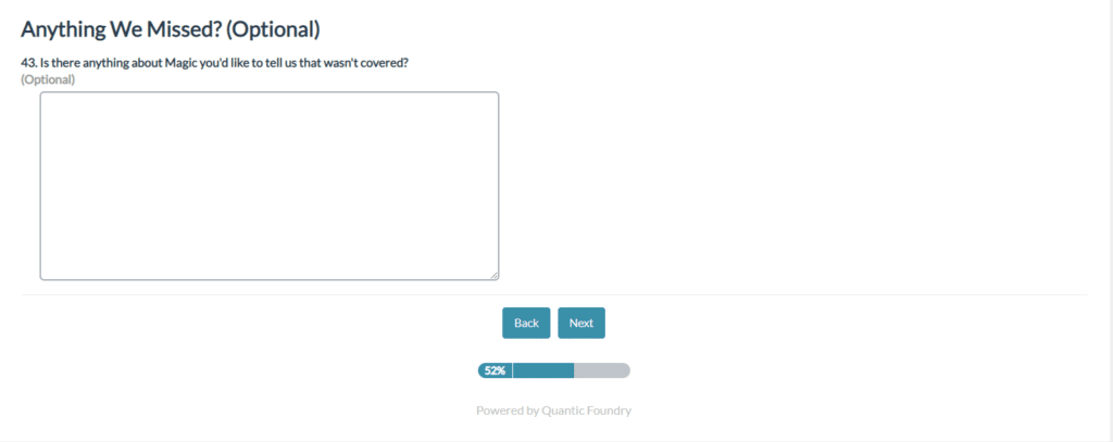 Is there something about how the game is being played or delivered that you disagree with? Some extensive questions on the back half of this survey inquire about what makes each MTG fan tick. Want the game to have an easier barrier-to-entry? How about including more opportunities for ‘gotcha’ moments that shock your opponents? If you have a strong opinion about something in this category, make your voice heard!