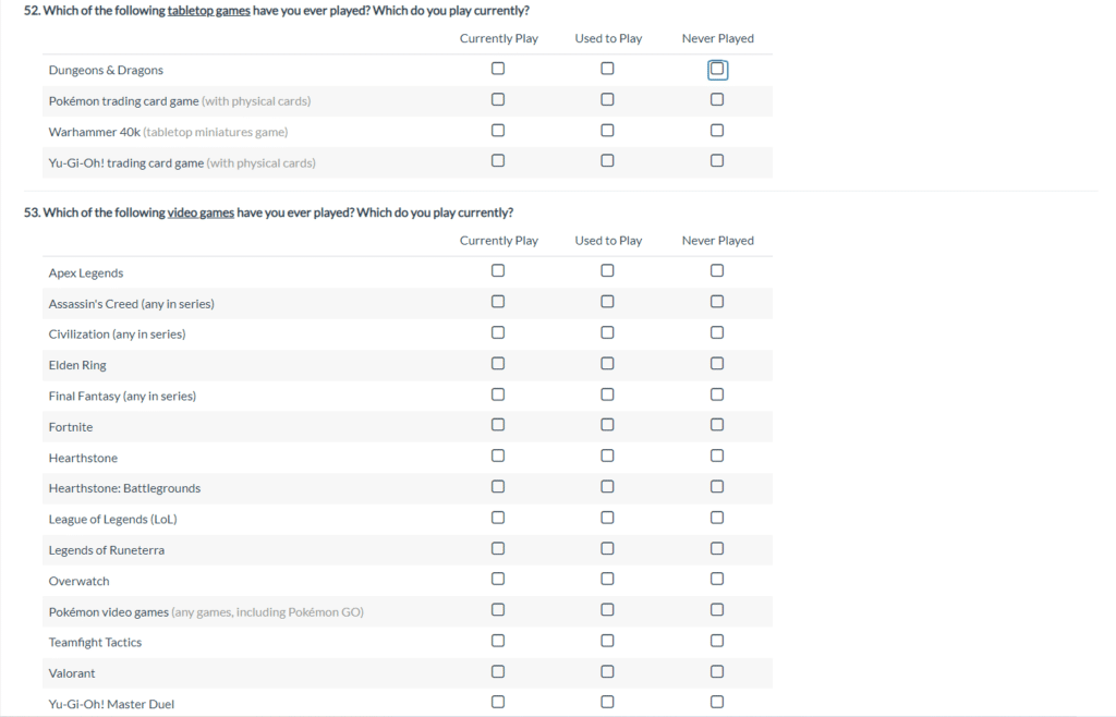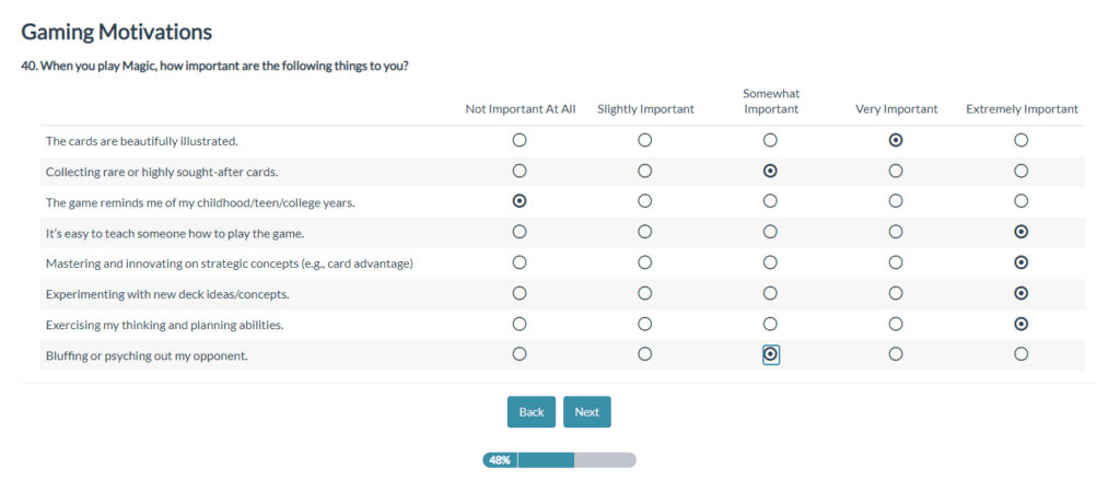 “Question 52 (this is too many questions, by the way), which is about the ages of people I have taught to play Magic, asks me to “choose all the apply” but will only let me select one option.” – Imnimo