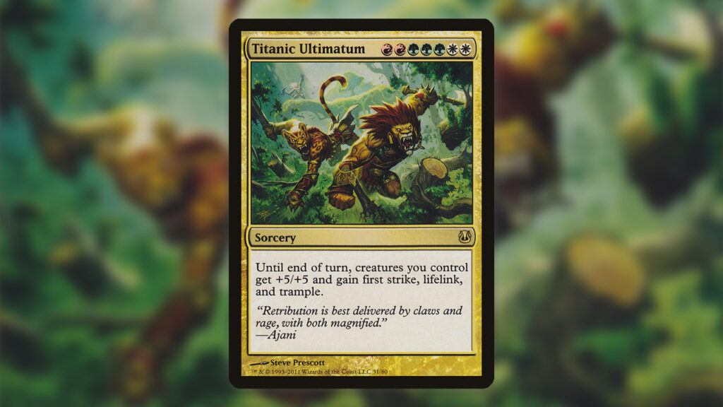 Titanic Ultimatum was a spell commonly recommended as an upgrade to the Raining Cats & Dogs Commander precon. This Overrun-esque effect is the board buff to end all board buffs, making all of your creatures gigantic while giving them a ton of different keywords, all to ensure that this combat is the last one.