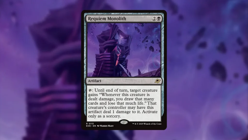 While the floor is already interesting, the ceiling for Requiem Monolith is ridiculous. At best, this card can partner with Dawnsire, Sunstar Dreadnought in Limited for an instant kill combo. Activate Requiem Monolith targeting your opponent’s creature, and use Dawnsire’s combat trigger to make your opponent lose 100 life and draw 100 cards. Pain for All, another new Edge of Eternities card, can create a similar combo. That said, this still requires Stationing 10 power into Dawnsire, which is a big ask.