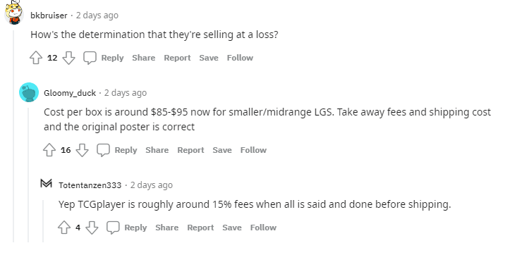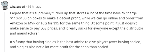 Let me be clear that we do not know the situation of any particular LGS out there, but with the math given here, the average LGS looks to be having a tough time making ends meet with current business models for sealed MTG products. I would not be surprised if the situation changes once some of the new cards get spoiled. This, therefore, could be a disguised opportunity for customers.