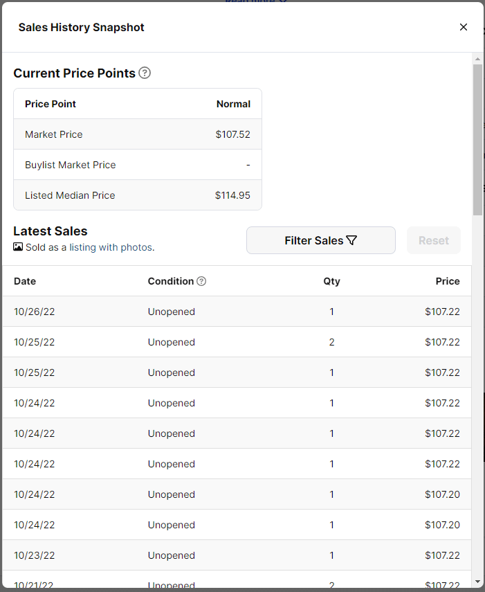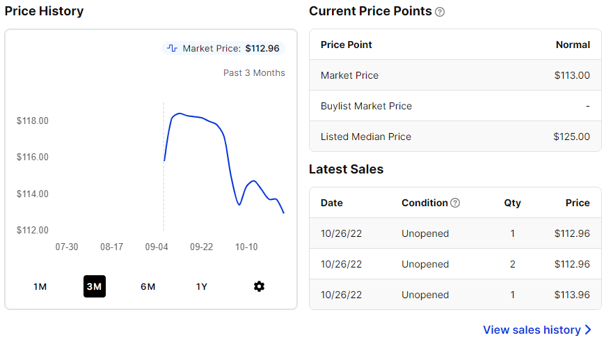 If we look at the current price of Draft Booster Boxes on TCGplayer, boxes are currently selling for $107 pretty consistently but still show signs of steady and slight decline over time. Even the best rates shown above would have a tough time making a profit at this price. Do keep in mind, however, that some larger LGS could have better rates than what is written above.