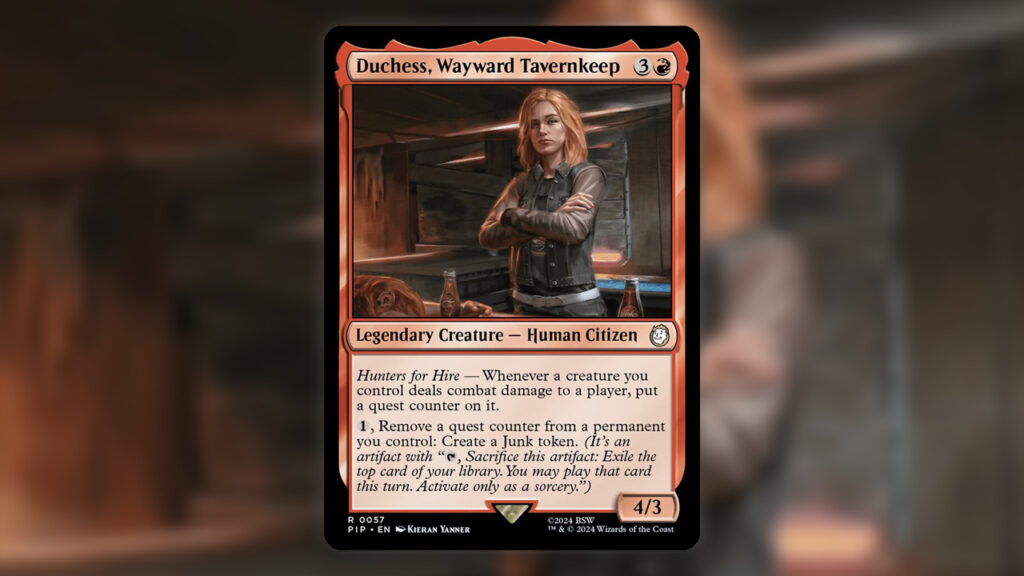 Take a look at Duchess, Wayward Tavernkeep. For four mana, you get a creature that does nothing. That’s right, it’s a 4/3 for four mana. No enters the battlefield. If you deal combat damage to a player you get to put a quest counter on a creature. Then if you also pay mana and remove said counter, you can create a Junk token. So five mana and combat damage to get one Junk token? Unimpressive. Dogmeat also generates Junk provided a modified creature attacks. Why would you cast this creature instead of Dogmeat a turn earlier?