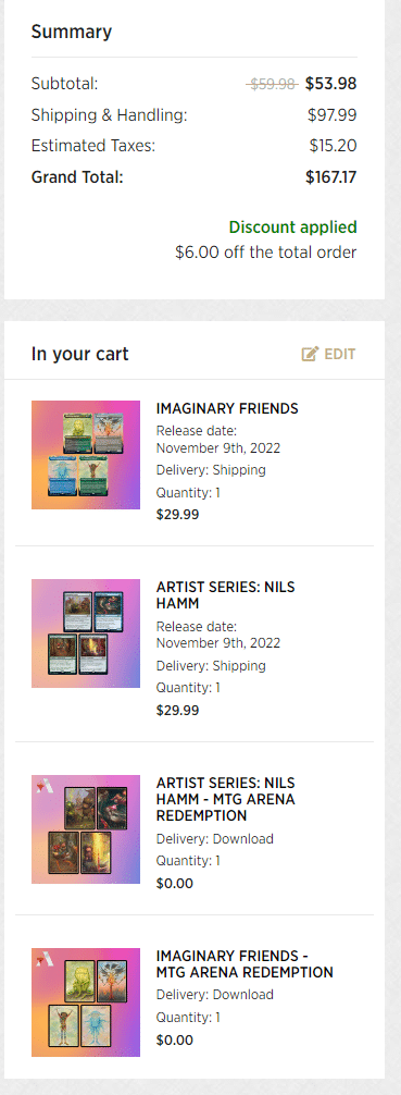While the price of the Secret Lairs themselves are relatively in order from our Australian fan, the shipping costs create a barrier. Even though two Secret Lairs are discounted to $53.98, the shipping comes in at a whopping $98, almost twice as much as the Secret Lairs. Suddenly, you’re only getting eight cards for a price comparable to Booster Boxes, where you can get as many as 36 packs of 15 cards each.
