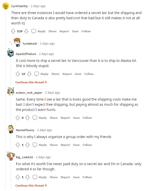 “There are three instances I would have ordered a secret lair but the shipping and then duty to Canada is also pretty bad (not that bad but it still makes it not at all worth it)” states Redditor CynthiaKitty.