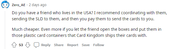 Another potential solution, as pointed out by Redditor Zero_AE, is to send your Secret Lair to a friend in the U.S. Past that point, your friend can ship it to you from them for a cheaper cost. However, this only works if the shipping costs are significantly reduced. If the change isn’t too significant, you’ll pay those shipping fees in time instead.