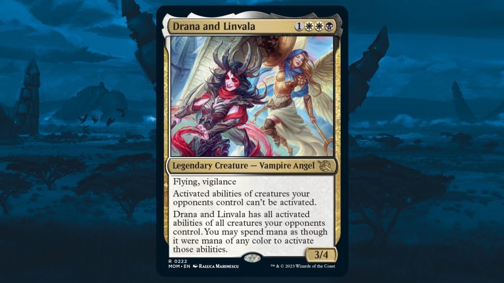 On the plane of Zendikar, the vampiric Bloodchief Drana and the Angel Linvala have come together. A 4 mana 3/4 flyer with Vigilance. Drana and Linvala turn off all of your opponent’s creatures’ activated abilities. In fact, not only do they turn those abilities off, but they steal them, gaining access to all of your opponent’s creatures’ activated abilities, and automatically fixing your mana to activate them. This is a brutal Stax effect, which will surely make the card kill on sight. This card could very well have multi-format potential, at least as a sideboard option, disabling everything from Llanowar Elves to Yawgmoth, Thran Physician.