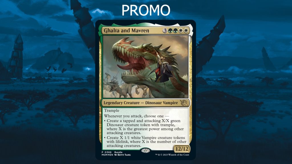 The Phyrexians never should have come to Ixalan. Mavren Fein, Dusk Apostle and Ghalta, Primal Hunger seem to have become best buddies on this powerful Vampire/Dinosaur card. This seven-mana Selesnya card may have a high cost, but it has even higher stats. A 12/12 with trample, this card has you covered whether you want a board full of small attackers, or a handful of powerful ones. If you want to go wide this can card generate X 1/1 White Vampire tokens equal to the number of other attacking creatures you control. If you want to go tall, then this card can generate a trampling Green Dinosaur token with power X where X is the greatest power among other attacking creatures you control.