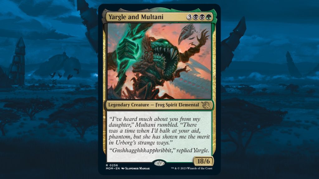 An absolutely bizarre card, Yargle and Multani shows a team-up between Yargle, Glutton of Urborg and Multani, Yavimaya’s Avatar. We haven’t had a new vanilla card since Spined Karok from Strixhaven back in April of 2021, but that almost two-year gap is now coming to a dramatic end. Yargle and Multani provide an absolutely absurd 18/6 statline for only six mana, double the stats of the original Yargle.